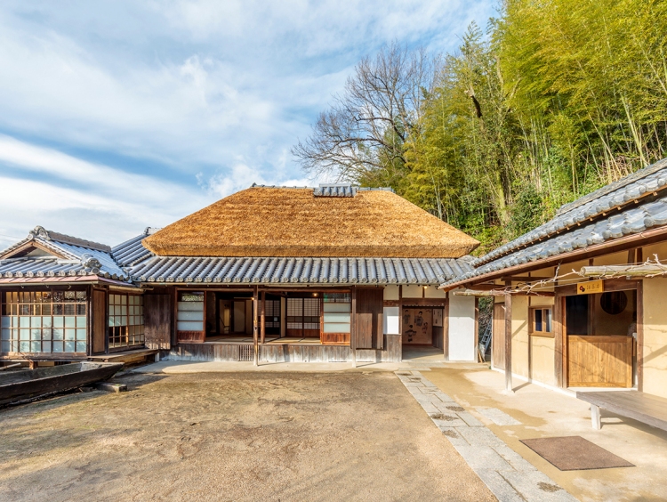 「夢二生家記念館」は有島生馬氏による“夢二ここに生る”の碑が門側に建つ、築約250年の茅葺屋根の家屋を作品と共に公開。